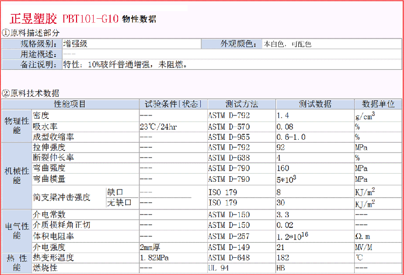 PBT101-G10 10%玻纤增强型 注塑增强级,10%玻纤,符合欧盟ROHS环保标准,极好的光洁度外观,优良的流动性,较低的纵横收缩率,适用于汽车,电器行业、保险盒,汽车继电器外壳等。