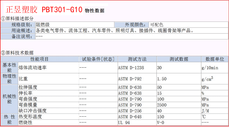 PBT301-G10 15%玻纤增强,提高流动性,高强度和刚性,抗冲击强度,极优的尺寸稳定性,蠕变性极低以及极优的长期耐磨耗性。电性能和化学品性优良,极佳的流动性,适合电机、电子、精密机械、造船、汽车机器制造工程制品各类通信网络接插件, 线圈骨架等。