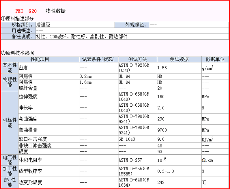 PET101-G20 20%玻纤增强型 注塑增强级,20%玻纤增强,符合欧盟ROHS环保标准,极优的表面光洁度,尺寸稳定性、热稳定性,蠕变性极低,极优的长期耐磨耗性,电性能和化学品性优良适合电子、精密机械、造船、汽车、机器制造、工程制品、保险盒、继电器外壳 、灯头灯罩等。